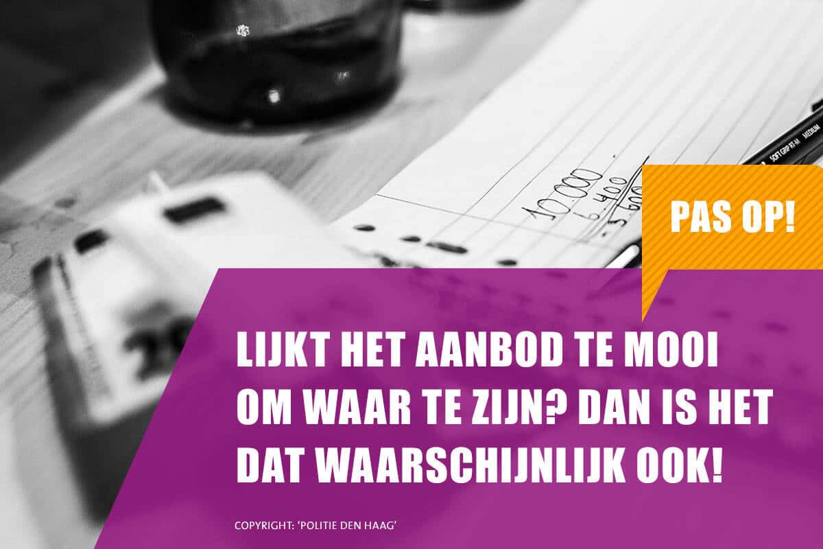 - Lijkt het aanbod te mooi om waar te zijn, dan is het dat waarschijnlijk ook. Wijs een ‘te mooi’ aanbod resoluut af en maak duidelijk dat je geen zaken doet met degene die het aanbiedt.